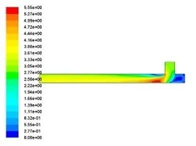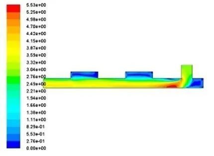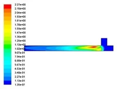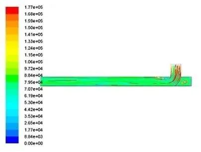 4.3.2計算結果 根據流體力學相關知識,設想若干種加速導料槽粉塵沉降的方法,并對其進行流體動力學仿真,仿真結果如下。 4.3.2.1 傳統導料槽仿真結果分析 (1)如圖14所示,末端落料管和導料槽成90°夾角,粉塵進入導料槽后,在沖擊點左側區域出現速度Z大值,隨后氣流速度向左逐漸趨于平緩,氣體趨于平穩運行,Z終保持恒定速度從左側出口流出。 (2)如圖15所示,導料槽中湍流強度在落料管入口處左側區域出現Z大值。此處,流體做湍流運動,即導料槽中氣體流線發生波浪式變化,振動頻率和振幅隨即發生變化,此處開始有小渦旋產生。由于湍流運動的作用,此處運動阻力較大,導料槽中夾雜粉塵的氣體能量產生損耗。之后湍流運動逐漸減弱,圖中自落料管入口處開始,越接近導料槽左端出口,湍流動能越弱。 圖14 傳統導料槽氣固兩相速度等值線分布圖 圖15 傳統導料槽湍流動能等值線分布圖 (3)如圖16所示,粉塵顆粒被誘導氣流攜帶進入導料槽,隨即運動方向發生變化。由于在落料管入口處誘導風出現小渦旋,粉塵顆粒在此處隨誘導風一起做回旋運動。隨后,粉塵顆粒隨氣流繼續向左方導料槽出口處運動,流線逐漸分明,運動趨于穩定。 4.3.2.2 擴容導料槽仿真結果分析 在傳統導料槽基礎上,加入擴容區。仿真結果如下圖17。 (1)加入擴容區之后,在氣流的通道上增加了兩個緩沖區。由于導料槽封閉,且入口出口條件相同,因此速度相對于傳統導料槽來說未有明顯變化。