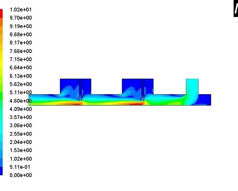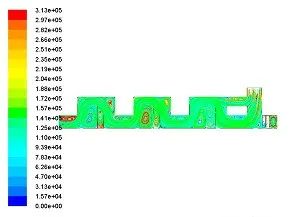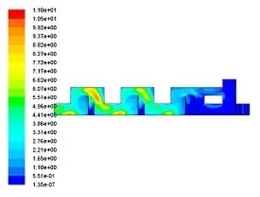 圖16 傳統導料槽顆粒相運動軌跡 圖17 擴容導料槽氣固兩相速度等值線分布圖 (2)加入擴容區之后,湍流區域向左大幅拓展。此處能量消耗更大,進一步加速了粉塵沉降過程。圖18中導料槽長度足夠,因此湍流動能自右向左Z終逐漸趨于平穩。但相比傳統導料槽,湍流的振動頻率和幅度都更強。 (3)加入擴容區之后,粉塵顆粒在擴容區隨誘導氣流產生小渦旋,顆粒運動軌跡不規則,流線發生交叉重疊,表示導料槽中湍流運動涉及范圍更廣,能量耗散更多。 4.3.2.3 阻尼簾導料槽仿真結果分析 在導料槽擴容區內安裝阻尼簾,攔截粉塵顆粒,加速自然沉降。仿真結果如下圖19。 圖18 擴容導料槽湍流動能等值線分布圖 圖19擴容阻尼簾導料槽速度等值線分布圖 4.3.2.4 迷宮阻尼簾導料槽仿真結果分析 (1)加入迷宮阻尼簾并與落料管聯通之后,氣流夾雜粉塵在導料槽中呈現S型路線。并在落煤管左側區域呈現“O”型流通區域。粉塵從落料口運動到導料槽出口的總距離相比傳統導料槽更長,因此能量耗散更多,有益于粉塵沉降。 (2)迷宮阻尼簾聯通導料槽幾乎整個流場均呈現湍流運動。且湍流動能相比傳統導料槽提高很多。導料槽尾部湍流動能較弱,流場相對穩定,有益于抑制粉塵從導料槽尾部反向逸出。 圖20 湍流動能等值線分布圖