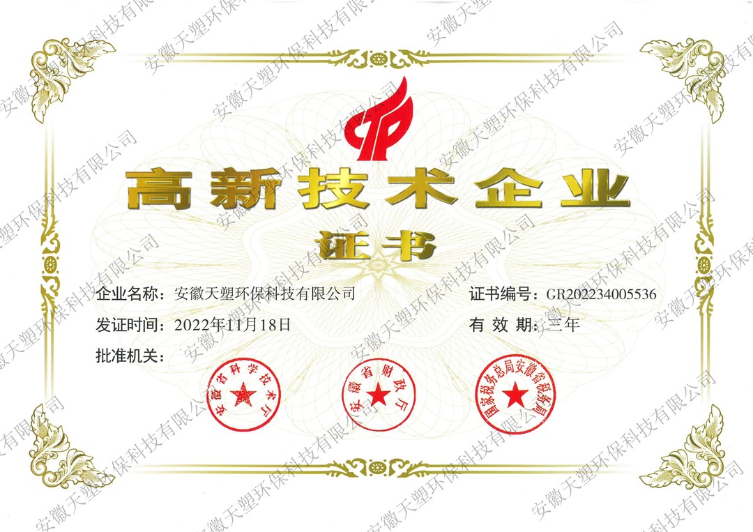 近日,安徽天塑順利通過了2022年高新技術企業認定審查工作,榮獲“高新技術企業”稱號! 證書編號:GR202234005536,該證書由安徽省科學技術廳、安徽省財政廳、國家稅務總局安徽省稅務局聯合頒發。
